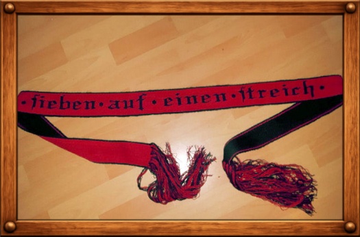 Der Gürtel „Sieben auf einen Streich“ war hingegen ein Auftrag. Die orange-weiße Borte entstand als „Test“, um zu sehen, was wirklich alles machbar ist – und hängt jetzt in unserem Wohnzimmer. Ja, ihr erkennt es … wir sind „Witcher“-Fans.