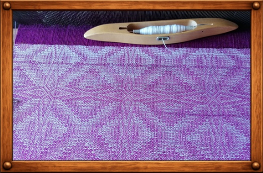 Und es fasziniert mich immer wieder, welche tollen und ausgefallenen Muster mit so einem mehrschäftigen Webstuhl entstehen. So war es mir auch möglich, für unseren Wohnwagen einen neuen Lampenschirmbezug zu weben – und die passenden Handtücher gleich dazu.